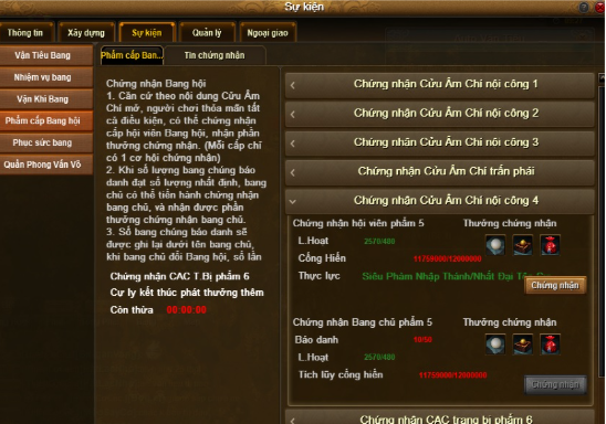 - Rất nhiều chuyến vận tiêu mỗi ngày, nguồn bạc vụn, minh linh đan, và tích cống hiến bang để mở quà phẩm cấp bang theo cửu âm chí(11000 điểm cống hiến/ lần cứ thế mà nhân lên), tích trữ một cách hợp lý có 1 nguồn kha khá kẹo để up nội công nhanh, vận tiêu nếu quan tâm đến điểm hiệp ác cũng có thể tiện điều chỉnh phù hợp với mình cần.