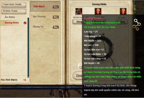 + Kỳ Kinh Thuận Dương Khiêu: cộng lực tay + chỉ số ngoại ( mở bằng cách học tầng 1 nội giang hồ đơn giản như huyết đao kinh, tàn dương đổi =10 huyết mai phiêu)