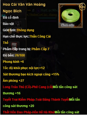 - Bảo vật + oa oa: Bảo vật theo cá nhân mình ưu tiên nhất là hồi nội lực càng nhiều càng tốt, quay âm hồn tầng cao rất nhanh hết nội lực, rồi lựa theo thực tế có thể thay dần vừa hồi nội lực vừa có bạo kích ngoại, st và tlsk, cơ bản như hình minh họa, đa phần là free, oa oa thì dĩ nhiên chọn hồi nội lực số 1, rồi đến bạo kích ngoại công rồi đến uy lực cận thân, rồi đến hồi khí huyết. Nếu bạn muốn thuần dame bỏ bớt nội lực có thể nghiên cứu dùng lắc độc dược, có 1 loại lắc rất ổn mà dễ kiếm, đó là Thập Tín Cấm Dược (tiếc là nuốt hết rồi không có ảnh chụp) ăn vào không phải chờ thời gian mà có tác dụng ngay, chế thì chỉ cần 1 clone độc sư lvl 0 chế thuốc tăng cường độc sư cơ bản (không phải thuốc bôi) với nguyên liệu là Hồng Phấn Bạch Chu (hàng cơ bản độc sư hái) rồi cứ thế spam là sẽ có hàng ngon bổ rẻ xài. Còn có điều kiện đừng quên sắm phản qua nhất kích giá chiêu hồi nội lực song kiếm quân tử đường :D