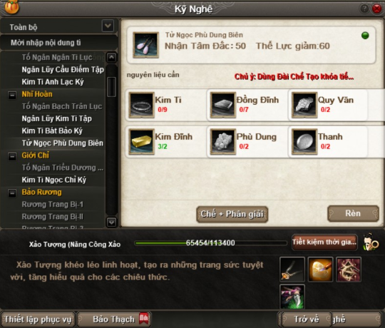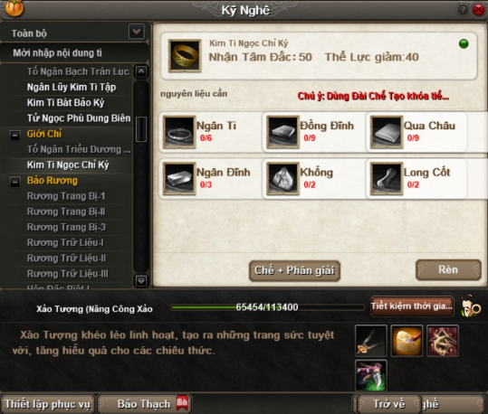 + Xảo tượng( thợ chế trang sức) - Nguyên liệu cần là bệ và một số vật liệu Long Cốt Thạch, Khổng tước thạch.