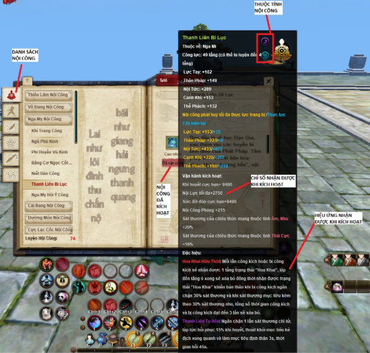 - Nội công là một tính năng tăng chỉ số nhân vật (máu, sát thương, phòng thủ …) và thêm hiệu ứng có lợi (buff) cho bản thân.