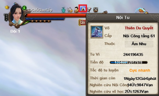 Tăng cấp nội công hoặc chiêu thức bằng cách nội tu. Mở giao diện nội tu ở góc trên bên phải (nút khoanh đỏ). Khi mở nội tu, cứ sau một khoảng thời gian tu vi sẽ được tự động chuyển hóa vào nội công/chiêu thức và thanh tiến độ tăng lên. Khi thanh tiến độ đầy sẽ tăng level nội công hoặc chiêu thức đang tu luyện.